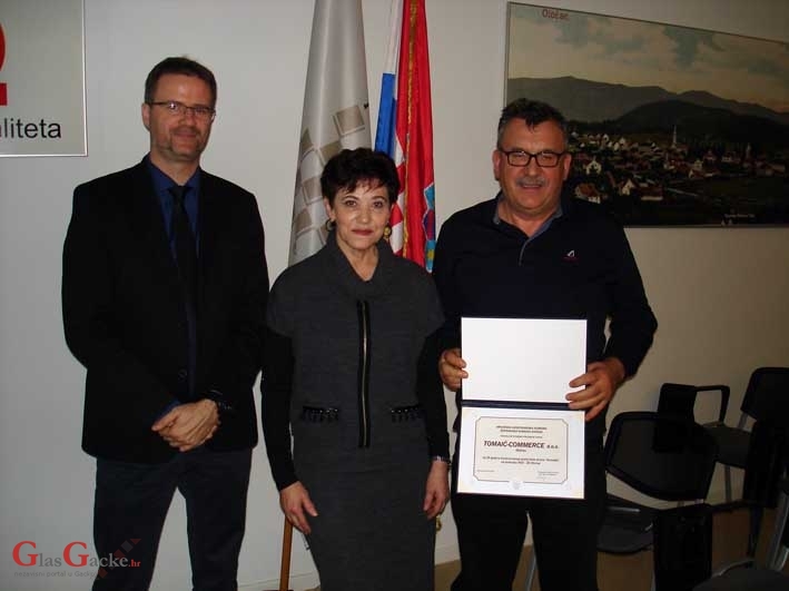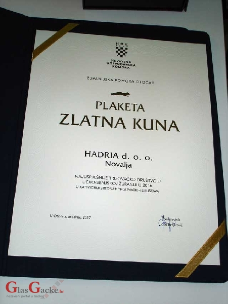 OTOČAC – Jučer su u Hrvatskoj gospodarskoj komori – Županijskoj komori Otočac dodijeljene plakete Zlatna kuna trgovačkim društvima Ličko-senjske županije za uspjehe u poslovanju u 2016. godini. Naime, županijske komore imaju pravo dodjeljivati ove plakete za uspješna trgovačka društva koja spadaju u veliko, srednje i malo trgovačko društvo. Kako na području Ličko-senjske županije nema velikoga trgovačkog društva, dodijeljene su plakete Zlatna kuna za srednje i malo društvo.