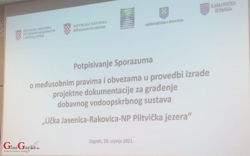 ZAGREB - Jučer je u Zagrebu održano svečano potpisivanje ugovora o provedbi izrade projektne dokumentacije za građenje vodoopskrbnog sustava LIČKA JASENICA-RAKOVICA- NP PLITVIČKA JEZERA , na kojem je uz ministre Ćorića i Božinovića, županicu karlovačke županije Furdek Hajdin, direktora Hrvatskih voda Zorana Đurokovića i ravnatelja NP Plitvička jezera Tomislava Kovačevića nazočila i zamjenica Ličko-senjskog župana Jasna Orešković Brkljačić koja je pozdravila sve prisutne u ime župana Ernesta Petrya kao i u svoje osobno ime.