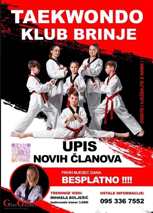 BRINJE – Bez podmlatka ništa! Taekwondo klub Brinje vrši upise za djecu svih uzrasta. Nije to samo poziv djeci, već i njihovim roditeljima da uoče važnost bavljenja športom njihova djeteta. Jer, kroz taekwondo se stječe disciplina, samopouzdanje i razviju se fizičke vještine. Prava blagodat za djecu suvremenih vremena, zaokupljenih svime i svačime.