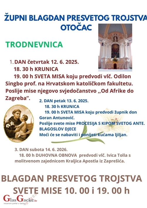 OTOČAC - 15. lipnja ove godine „pada“ blagdan Presvetog Trojstva, a presveto Trojstvo je patron otočke župe. Tako važan i veliki blagdan mora biti i primjereno slavljen i proslavljen, pa već danas počinje trodnevna priprava.