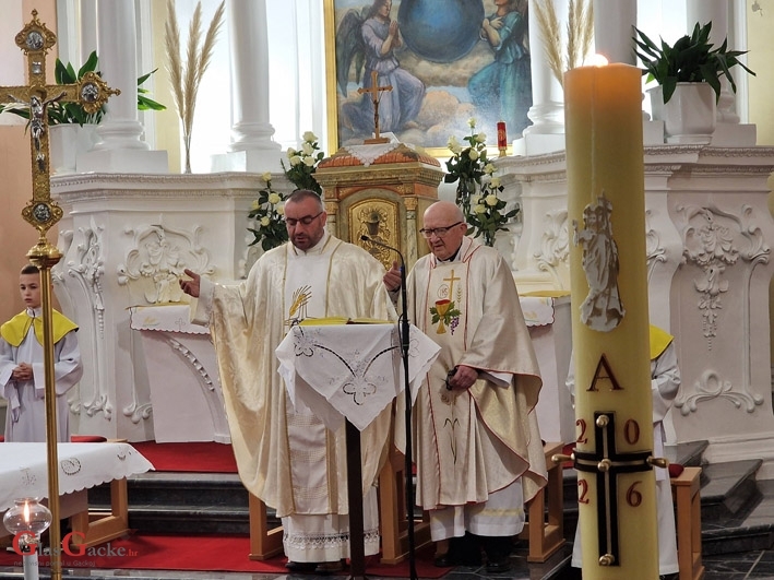 OTOČAC - Na Uskrs je središnje svečano misno slavlje u 10 sati u župnoj crkvi Presvetog Trojstva predvodio i propovijedao župnik Goran Antunović u zajedništvu s Jurom Ladišićem. Crkva ispunjena dupkom puna od klupa, kore, galerije i lađa.