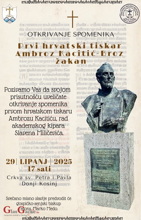 KOSINJ - Svečano otkrivanje biste Ambroza Kacitića, prvoga hrvatskog tiskara, uz četiri popratne spomen-ploče (tiskaru, pavlinskom samostanu, lokaciji njegova rođenja i Kosinjskoj tiskari) bit će na Petrovu, 29. lipnja s početkom u 17 sati u Donjem Kosinju, na prostoru crkve sv. Petra i Pavla.