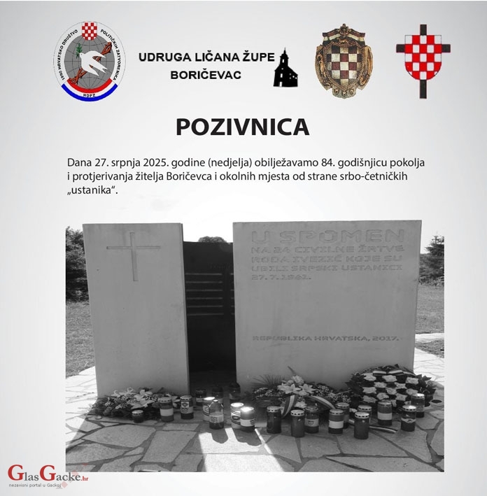 BORIČEVAC – Udruga Ličana župe Boričevac obavještava i poziva da će 27. srpnja biti obilježena 84. godišnjica pokolja i protjerivanja Boričevlja i žitelja iz okolnih mjesta, što je učinila četničko-partizanska zločinačka ruka.