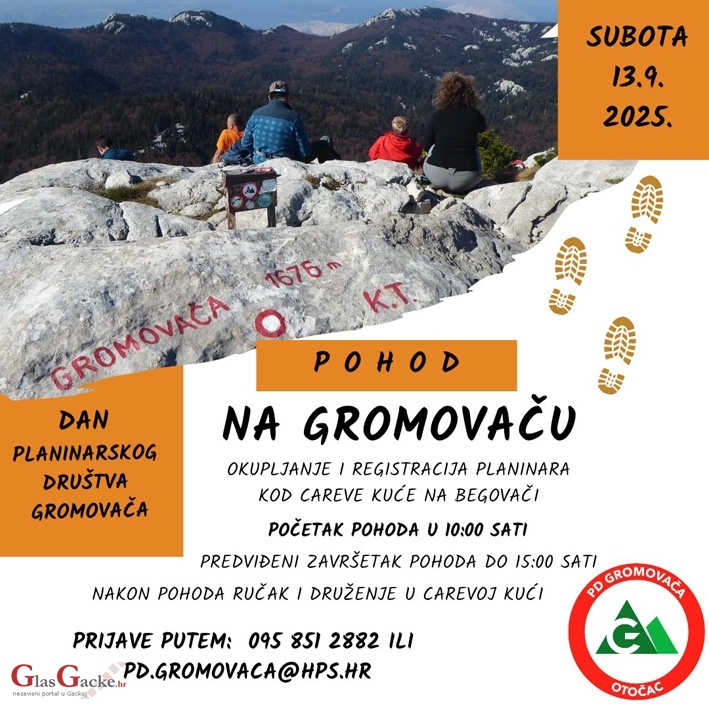 OTOČAC – Planinarsko društvo Gromovača povodom dana utemeljenja Društva organizira 13. rujna (subota) pohod na Gromovaču. Okupljanje i registracija planinara je kod Careve kuće na Begovači. Početak pohoda je u 10 uri, a planirani povratak s pohoda je do 15 uri.