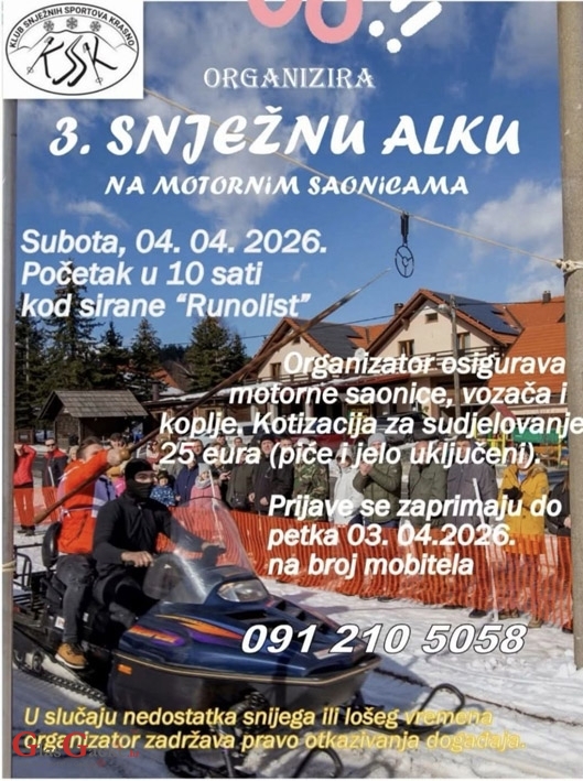 KRASNO - Klub snježnih športova Krasno 4. travnja u Krasnu organizira 3. Snježnu alku na motornim saonicama. Organizator osigurava motorne saonice, vozača i koplje, a kotizacija za sudjelovanje iznosi 25 eura, u što su uključeni jelo i piće.