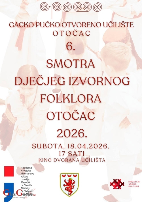 OTOČAC - Gacko pučko otvoreno učilište Otočac organizira 6. Smotru dječjeg izvornog folklora, koja će se održati 18. travnja u velikoj dvorani Učilišta.