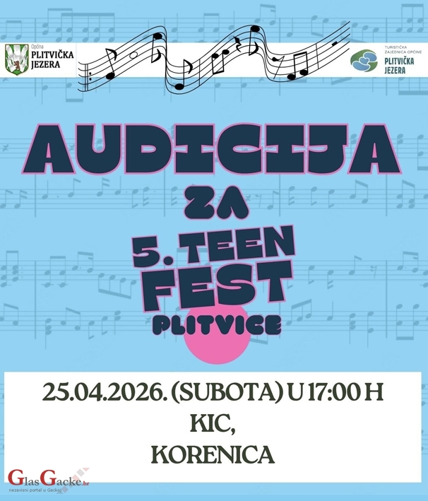 KORENICA - Audicija za 5. Teen Fest Plitvice, održat će se u subotu, 25. travnja u KIC-u od 17 sati.