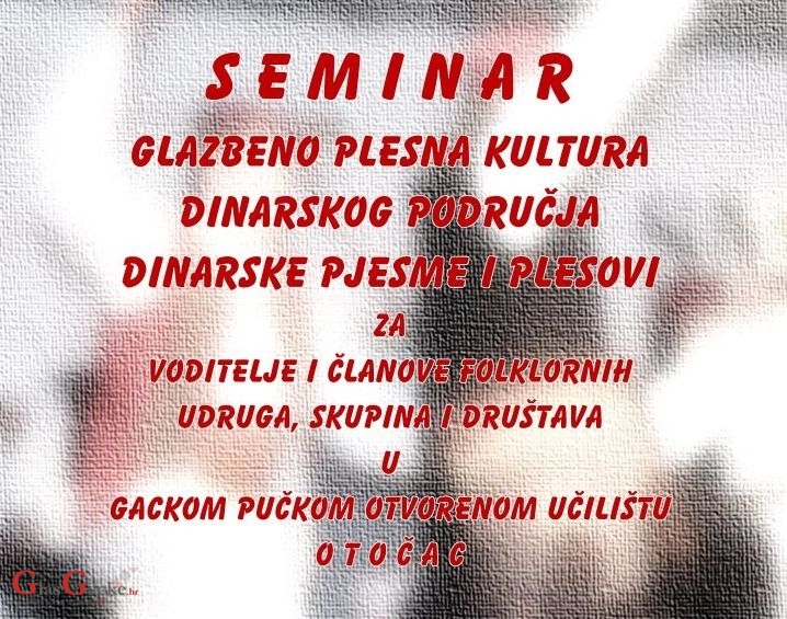 OTOČAC - Gacko pučko otvoreno učilište Otočac organizira seminar Dinarske pjesme i plesovi: glazbeno-plesna kultura dinarskog područja namijenjen voditeljima i članovima folklornih skupina, društava i udruga koji će 10. i 11. ožujka 2018. biti održan u prostorijama Gackog pučkog otvorenog učilišta u Otočcu.