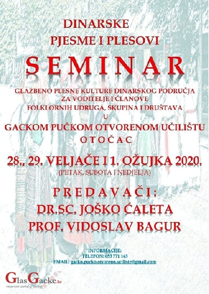 Iako ima još cijeli tjedan toga roka, 14. veljače istječe mogućnost prijave za seminar Dinarske pjesme i plesovi: glazbeno-plesna kultura dinarskog područja. A taj će seminar biti održan 28. i 29. veljače (srećom ove godine veljača ima taj dan viška) te 1. ožujka, naravno da će biti u Otočcu u Gackomu pučkom otvorenom učilištu