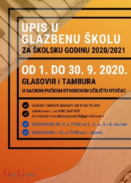 OTOČAC - Upis u prvi razred glazbene škole za polaznike odjela glasovir i odjela tambura za školsku godinu 2020/2021 bit će od 1. do 30. rujna svakim radnim danom od 8 do 15 sati, osobno u prostorijama Gackoga pučkog otvorenog učilišta Otočac, telefonski na broj 098 245 537 ili e-mailom na dkranjcevic8@gmail.com. Minimalna dob za upis učenika u glazbenu školu je 8 odnosno 9 godina, tj. uvjet za upis zadovoljavaju učenici koji su završili minimalno 2. razred redovnog osnovnoškolskog obrazovanja.