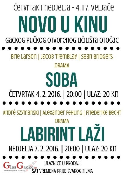 „Soba“ i „Labirint laži“ dva su filmska naslova koji će ovaj tjedan biti projicirani u kinu Gackog pučkog otvorenog učilišta Otočac. Drama „Soba“, nominirana za Oscara u četiri kategorije, bit će prikazana u četvrtak, 4. veljače u 20 sati, dok će u nedjelju, 7. veljače u 20 sati biti prikazan njemački film „Labirint laži“ utemeljen na stvarnim događajima o istrazi i suđenju nacističkim zločincima.
