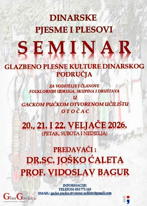 OTOČAC - Prijave za 11. Seminar dinarskih pjesama i plesova su završene, a sljedeći vikend, od 20. do 22. veljače, u Otočcu će započeti još jedno izdanje ovog značajnog edukacijskog programa koji organizira Gacko pučko otvoreno učilište Otočac.