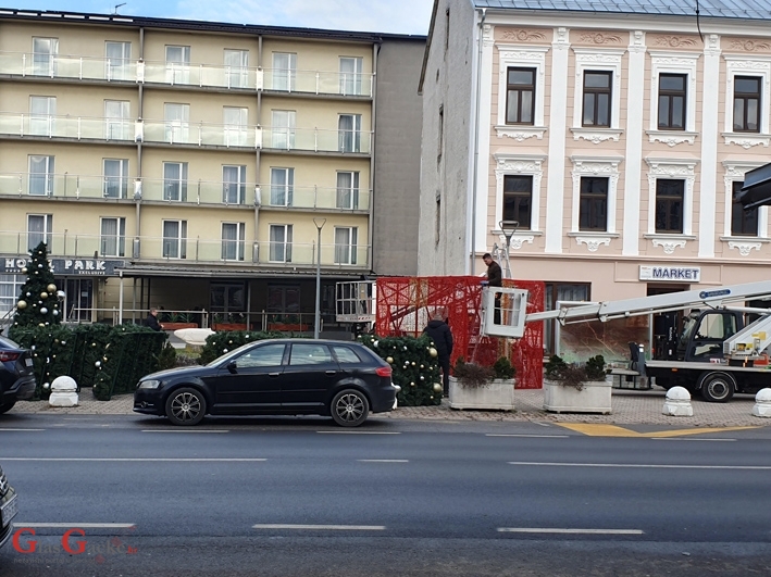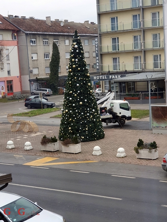 Na „krasnajoj ploščadi“ u središtu grada došlo vrijeme da se instalira umjetni bor. Dovukli ga u dijelovima, a treba i „košara“ kako to sve podići i smontirati. Došle i „košare“, a električari se trude to sve sastaviti i žaruljice pospajati da može noću blještati. Valjda i hoće, mora.